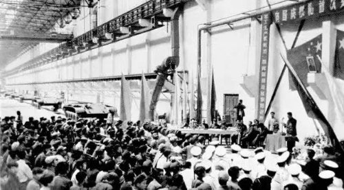 1959年是中華人民共和國(guó)建國(guó)十周年,工廠接受了生產(chǎn)32輛坦克交部隊(duì)編隊(duì)參加檢閱的任務(wù)。強(qiáng)烈的榮譽(yù)感使全廠上下歡欣鼓舞、斗志旺盛。“決心書(shū)”、“保證書(shū)”像紛揚(yáng)的雪花貼滿墻壁?!疤齑蟮睦щy也要戰(zhàn)勝,堅(jiān)決為國(guó)爭(zhēng)光,為廠爭(zhēng)譽(yù)”的豪情在人們心中激蕩。
