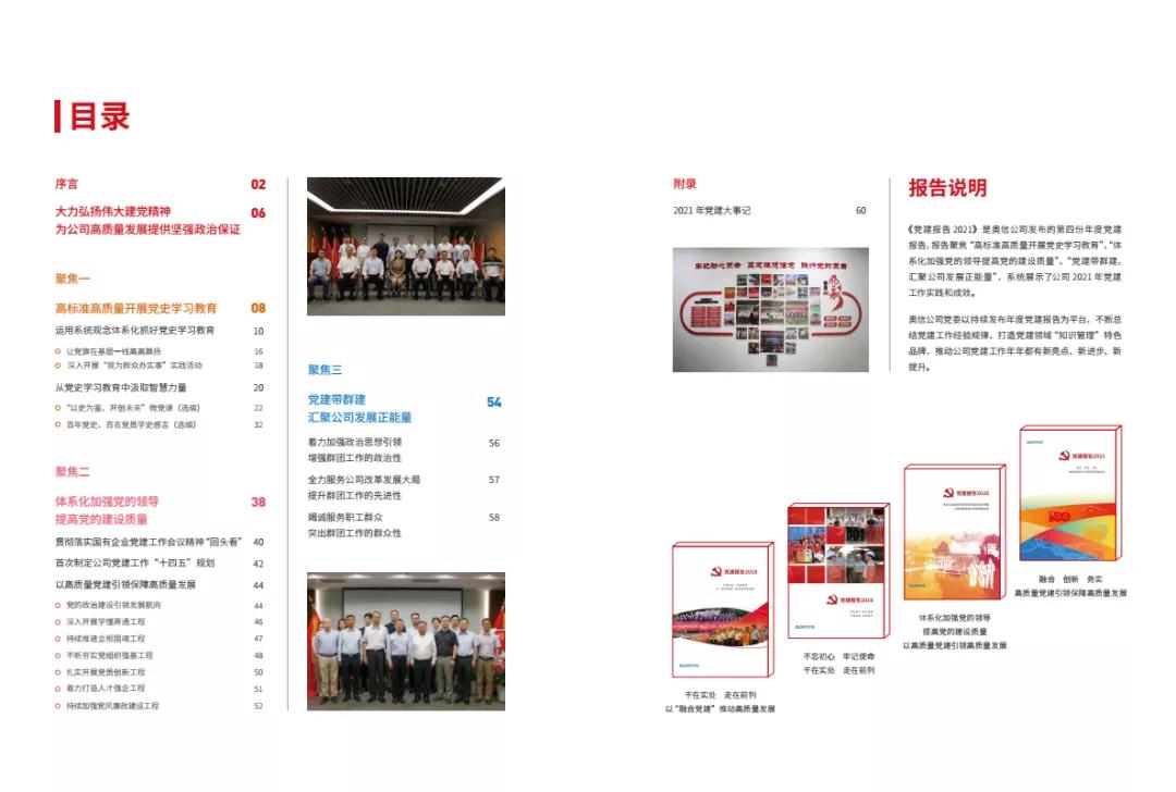 作為奧信公司黨建工作創(chuàng)新成果,《黨建報告2021》聚焦 “高標準高質(zhì)量開展黨史學習教育”、“體系化加強黨的領導提高黨的建設質(zhì)量”、“黨建帶群建,匯聚公司發(fā)展正能量”,全面展示了公司2021年黨建工作實踐與成效。報告既是奧信公司黨委和16個黨支部、102名共產(chǎn)黨員向上級黨組織交出的一份黨建工作答卷,也是弘揚偉大建黨精神,奮力走好新時代“趕考之路”,以高質(zhì)量黨建引領保障高質(zhì)量發(fā)展,不斷推動企業(yè)做強做優(yōu)做大的動員令。