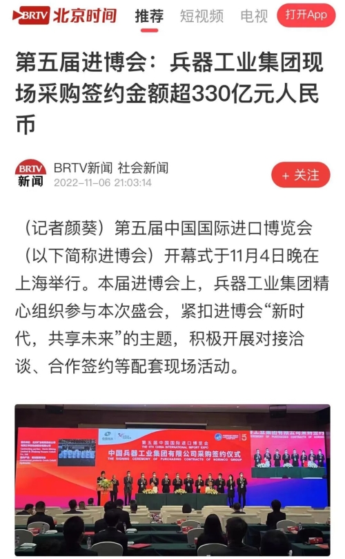 北京時(shí)間:第五屆進(jìn)博會(huì):兵器工業(yè)集團(tuán)現(xiàn)場(chǎng)采購(gòu)簽約金額超330億元人民幣